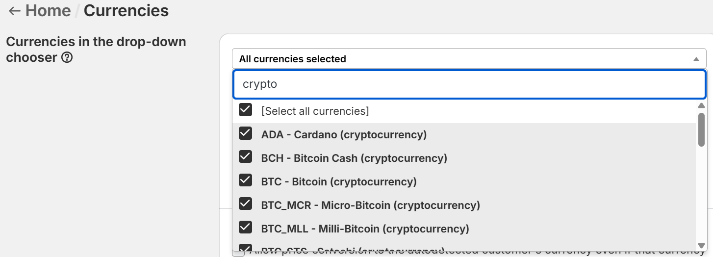 You can select or deselect them easily in the app preferences dashboard page within the Currencies section of the app: