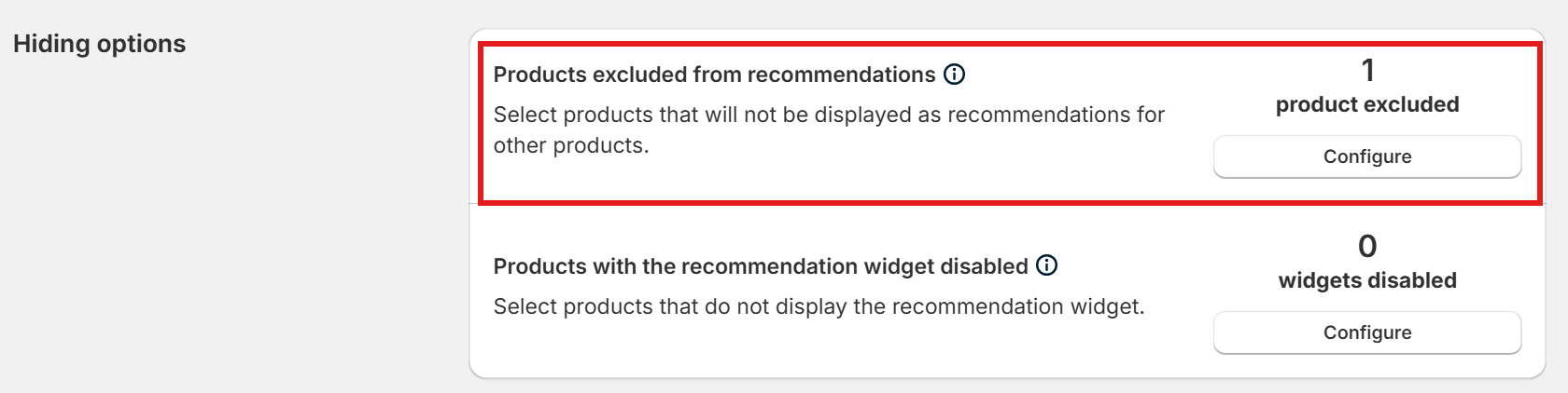As we mentioned before, you can configure excluded products by tagging products with the exact text Hidden recommendation.