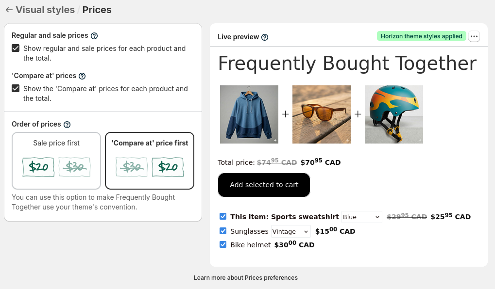 By default, Frequently Bought Together displays the compare at price after the sale price when a product is on sale and the app is configured to display both prices.