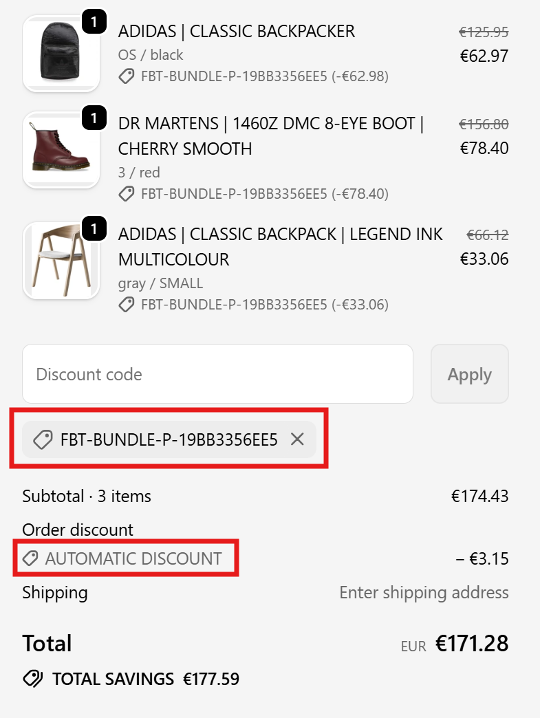 The following image shows a Frequently Bought Together discount combined with a Shopify automatic discount: