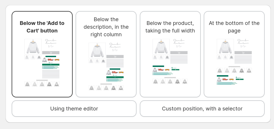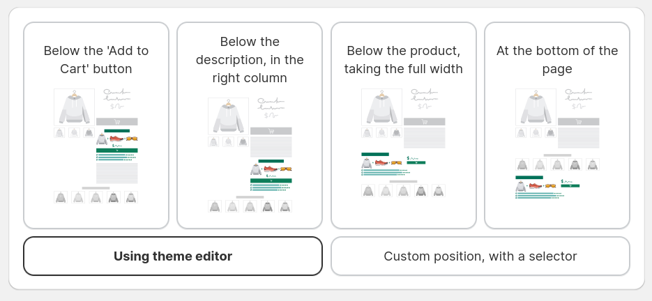 With these predefined positions, you can easily place the widget in the most suitable spots without editing any code. It's the ideal option for the most common Shopify themes.