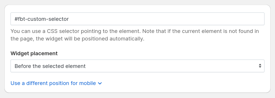 You just need to enter a CSS selector pointing to the HTML element where you want the widget to appear. Then, you can choose its exact placement (before, after, as child, or first child of the selected element). This option provides maximum flexibility to fit any layout.
