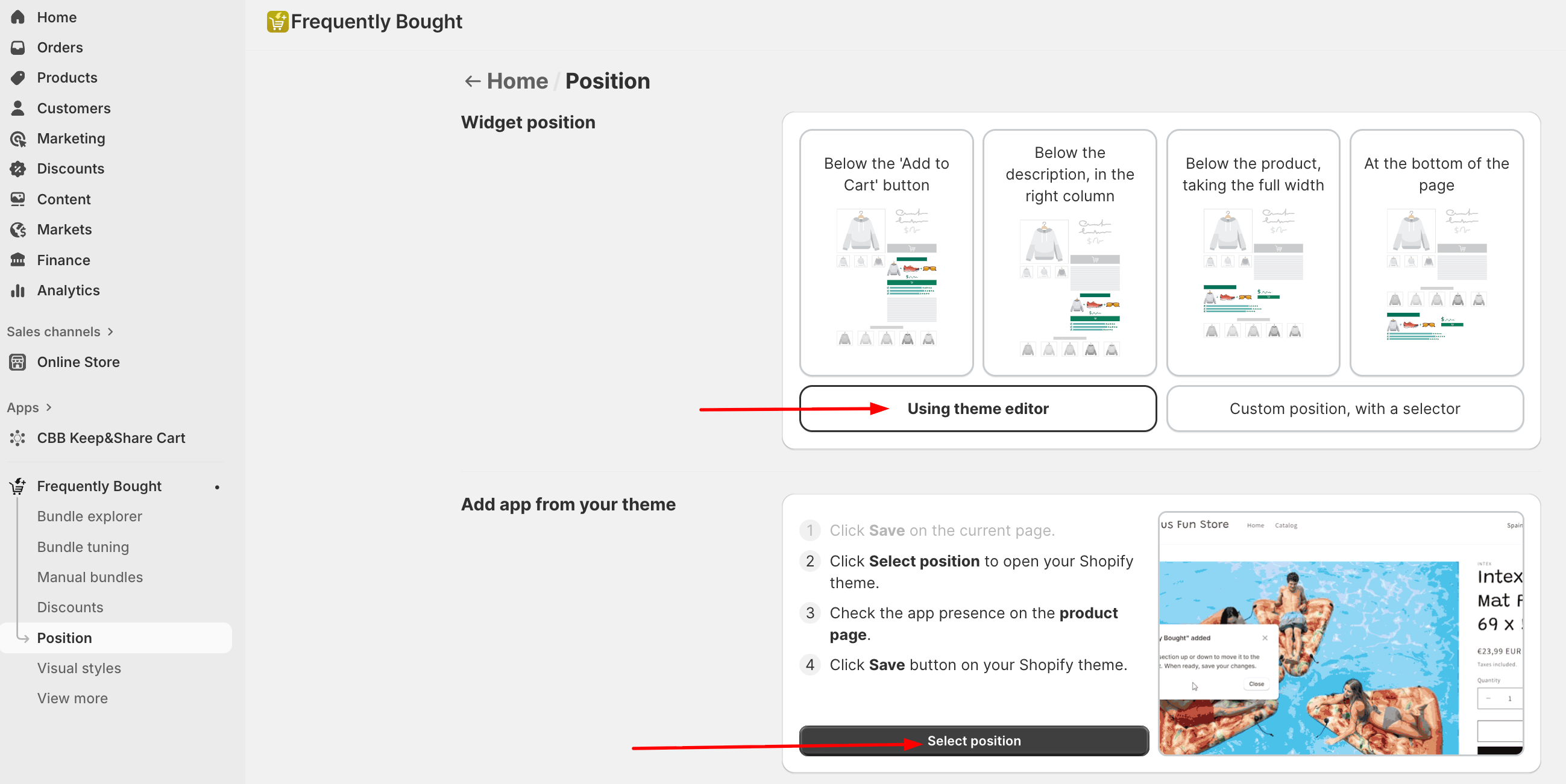 If the predefined options don’t fit your layout, you can manually place the widget using Shopify’s built-in Theme Editor or Custom position with a selector option.
