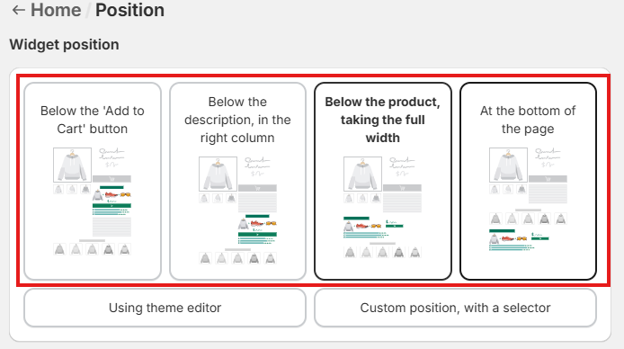 This is the easiest and most reliable method for most Shopify themes. However, if the predefined options don’t fit your layout, you can manually place the widget using Shopify’s built-in Theme Editor or Custom position with a selector option.