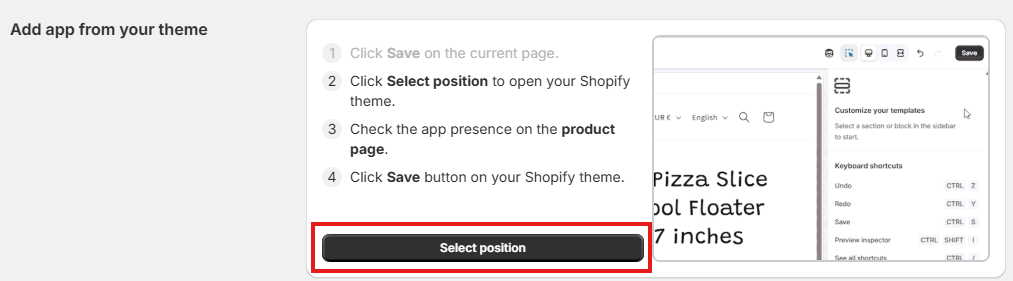 - Once you save, you the button 'Select position' will be actionable - so click it and it will open the Shopify Theme Editor