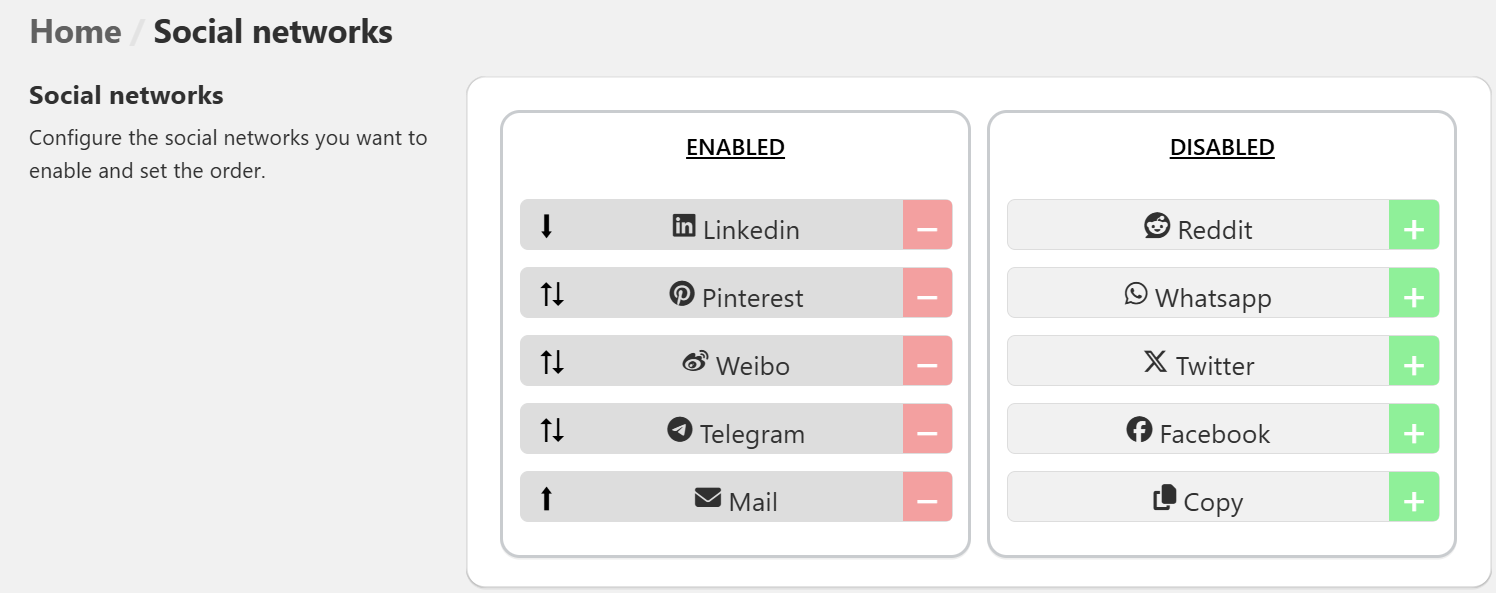 You can enable or disable them anytime in the 'Social networks' section (click the green '+' icon to enable or the red '-' icon to disable: