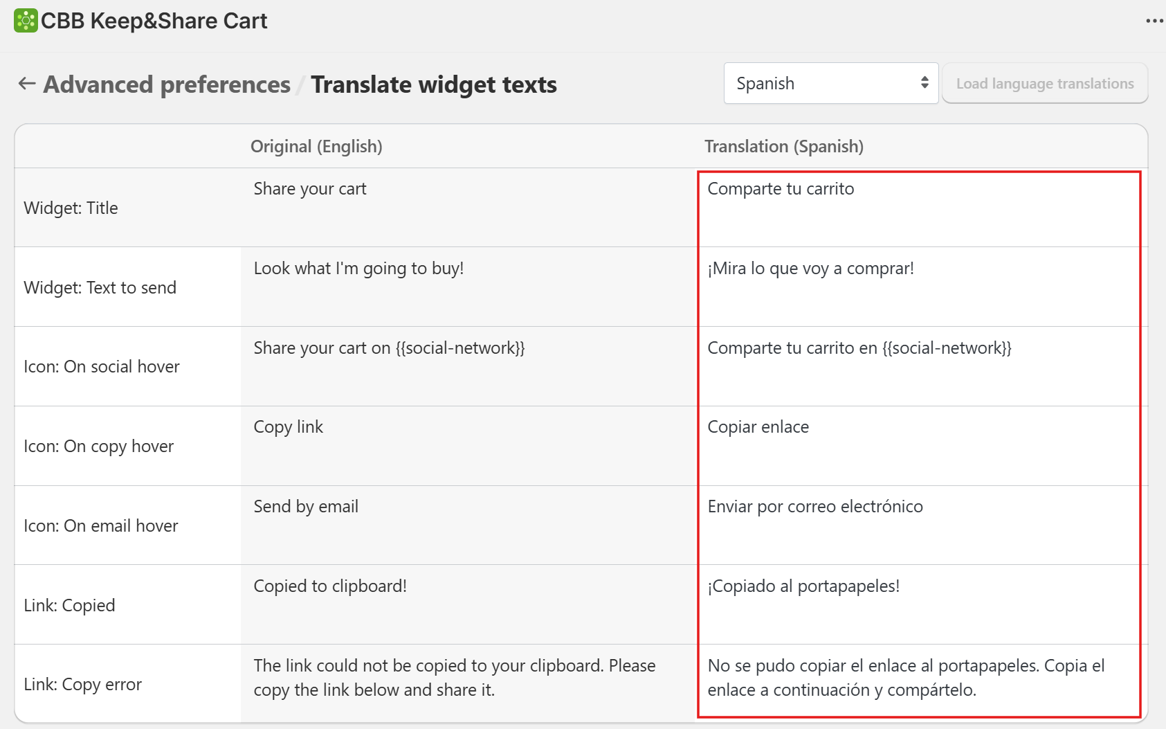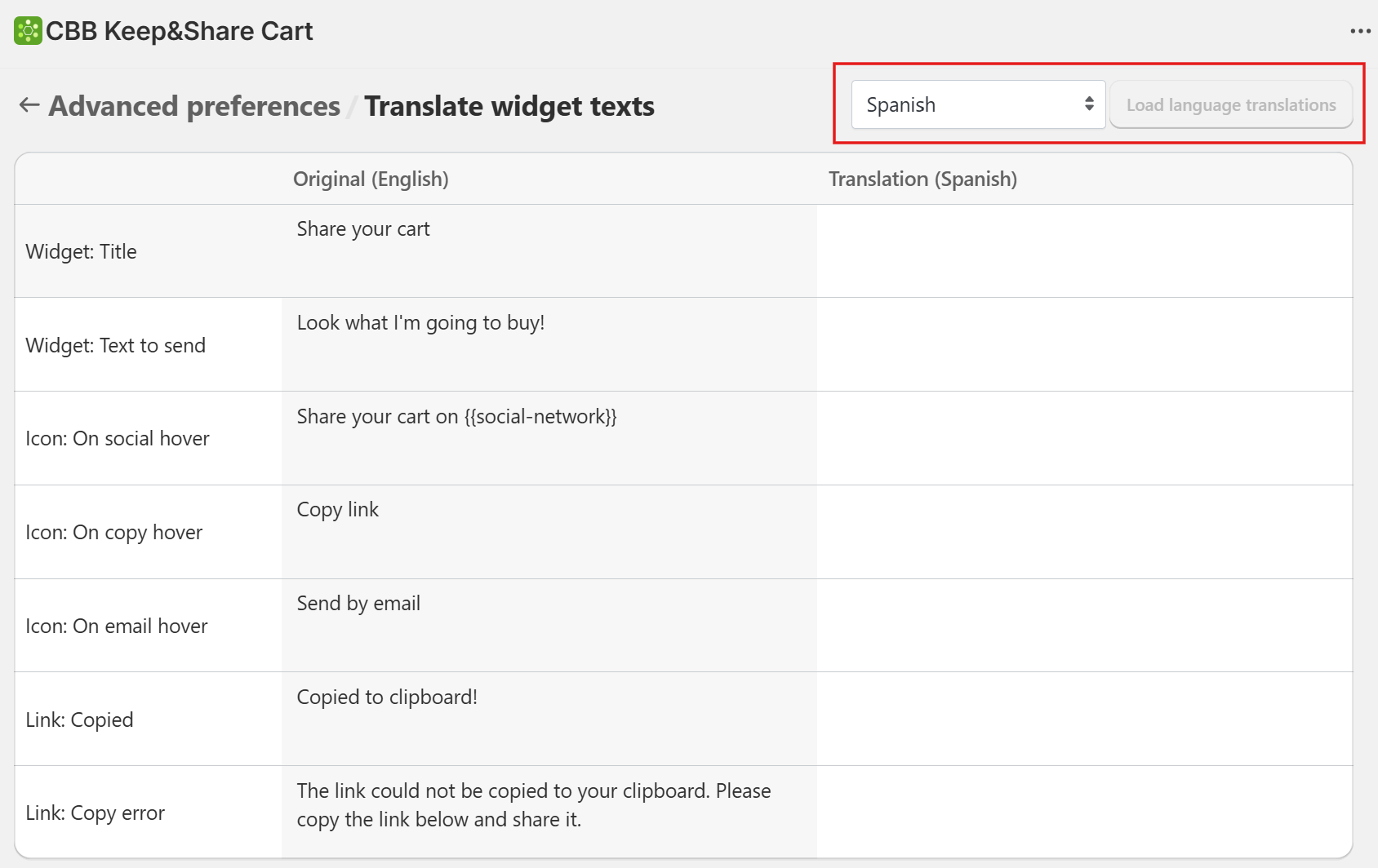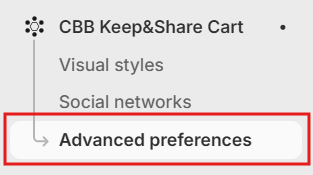 Keep & Share Your Cart widget translations can be created directly from our preferences pages. To do so, go to the Advanced preferences section:
