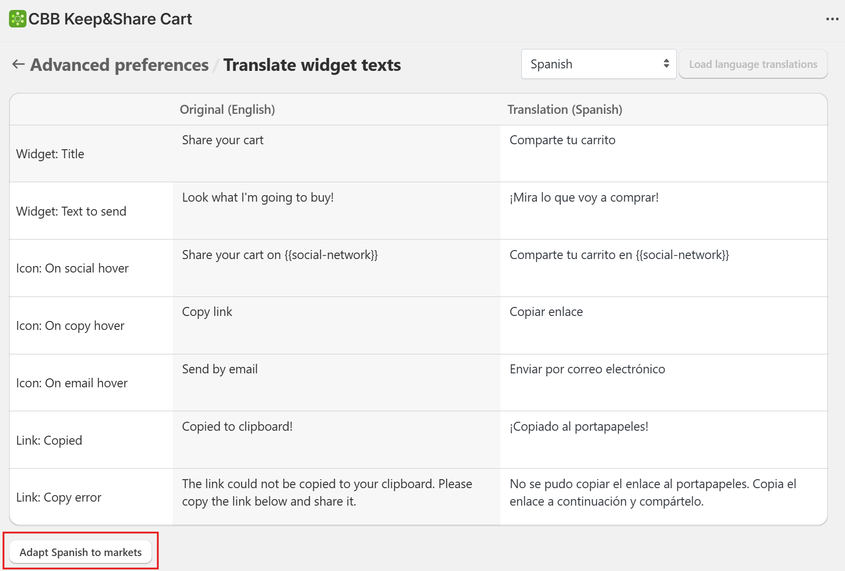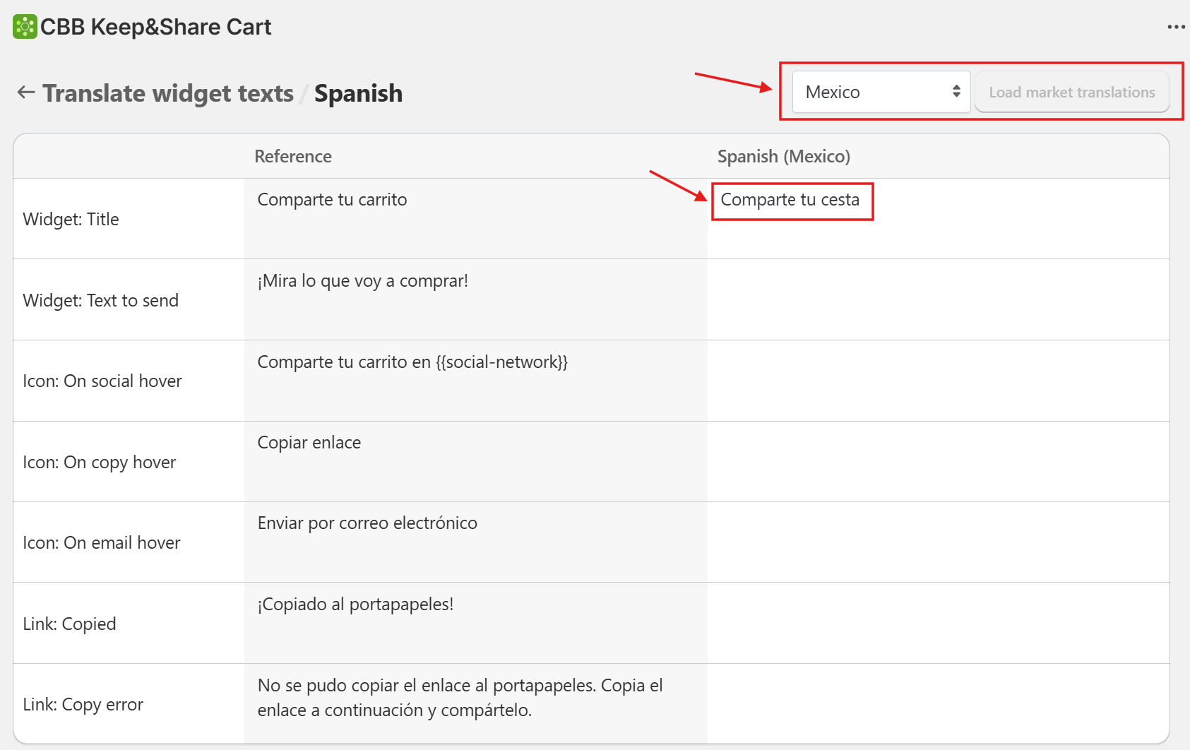 For example, if we adapt the Spanish language to the Mexican market by changing the title text from 'Comparte tu carrito' to 'Comparte tu cesta':
