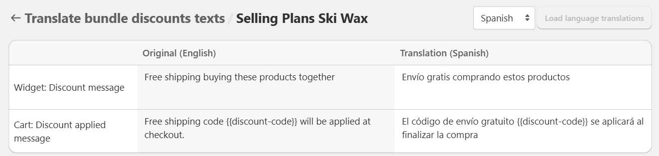 However, if you have configured individual bundle discounts, you will need to translate these two messages for each individual discount. For example: