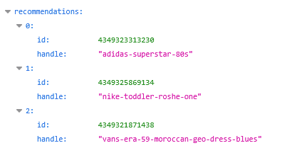 The response includes ID and handle of the recommended products, according to your configured preferences: