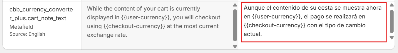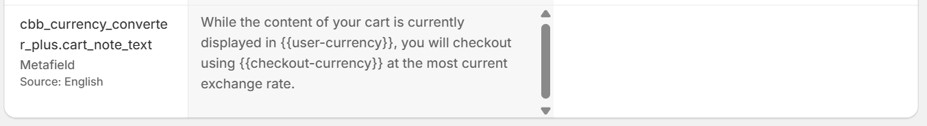 Once inside, look for the following metafield: 'cbb_currency_converter_plus.cart_note_text' (if you can't find it, please visit this related article):