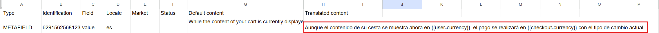 For example, to translate the cart note from the English default language to the Spanish language, look for the original cart note text and for the "es" locale, and add the translated text in column H ("Translated content"):