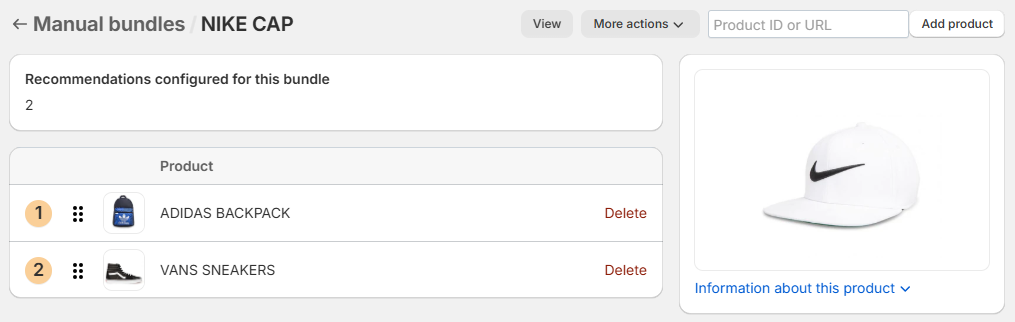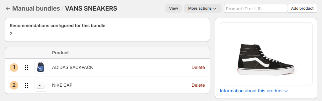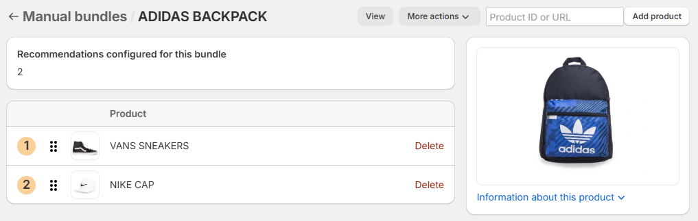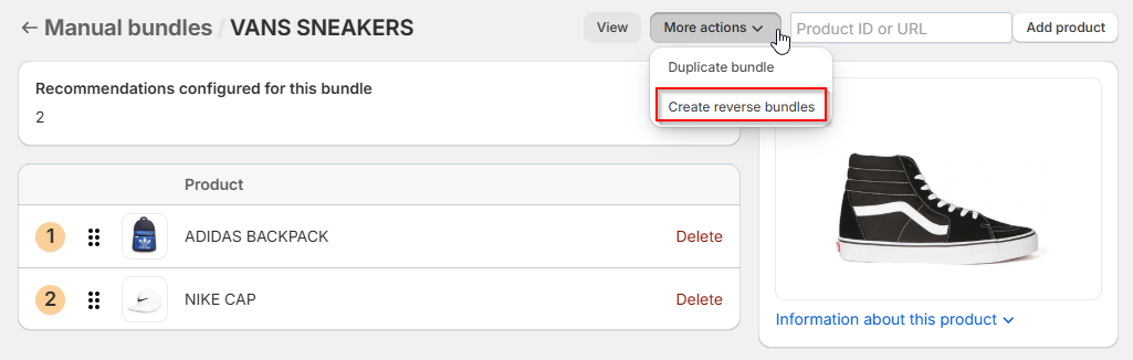 First of all, when we refer to reverse bundles, we mean the replication of a product bundle in all its recommendations. That is, let's assume we have a manual bundle for the product VANS SNEAKERS with recommendations NIKE CAP and ADIDAS BACKPACK: