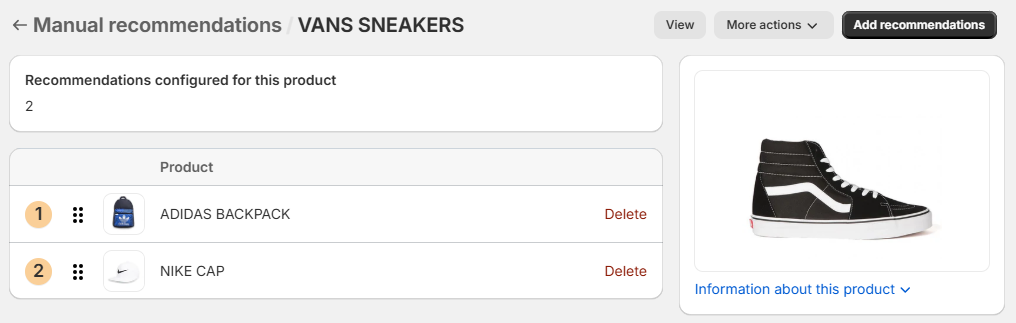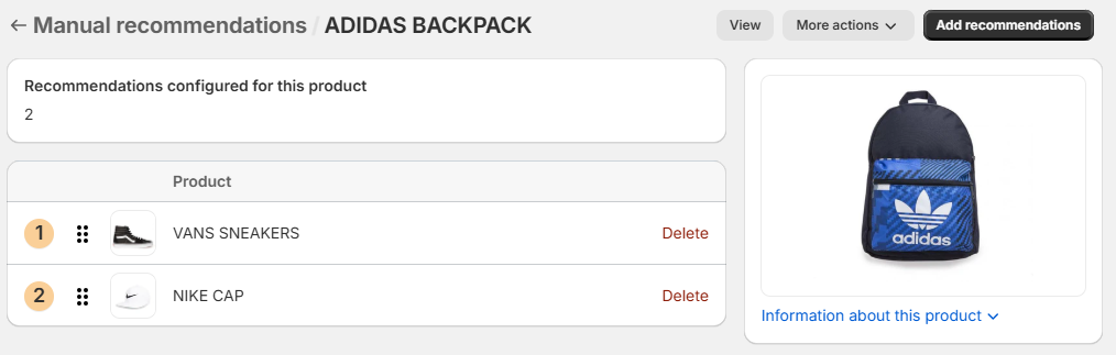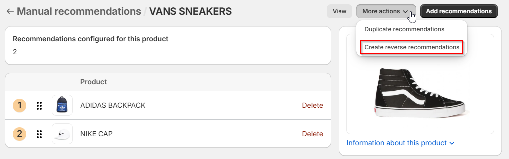 First of all, when we refer to reverse recommendations, we mean the replication of a concrete product recommendations in all its recommended products. That is, let's assume we have configured the manual recommendations ADIDAS BACKPACK and NIKE CAP for the product VANS SNEAKERS: