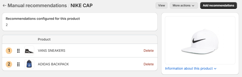 Product NIKE CAP, with recommendations VANS SNEAKERS and ADIDAS BACKPACK:
