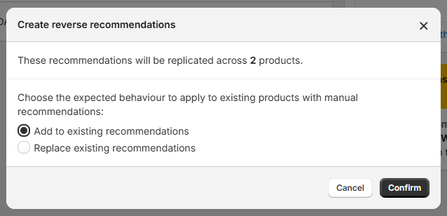 To create reverse recommendations, simply go to the manual recommendations configuration page of a concrete product and click on the Create reverse recommendations option: