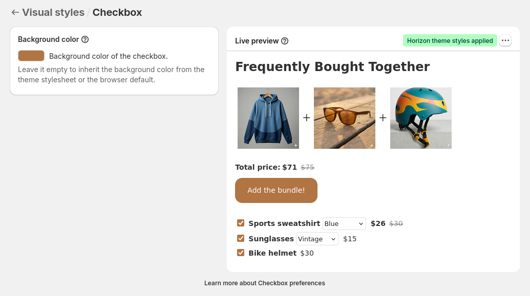Frequently Bought Together allows you to easily customize the color of the checkboxes to better match your theme.