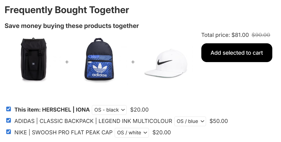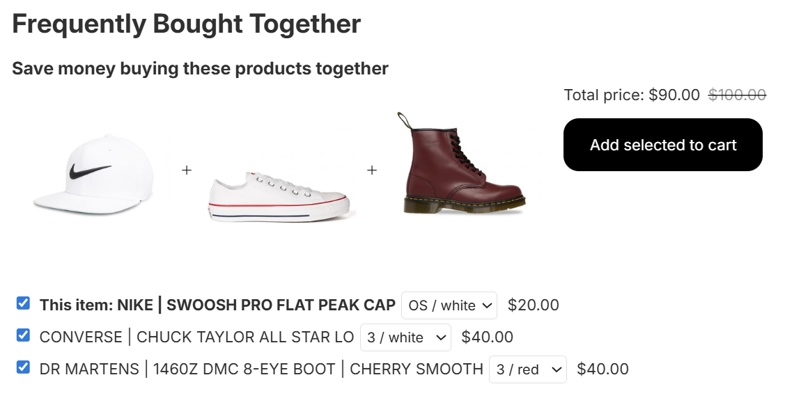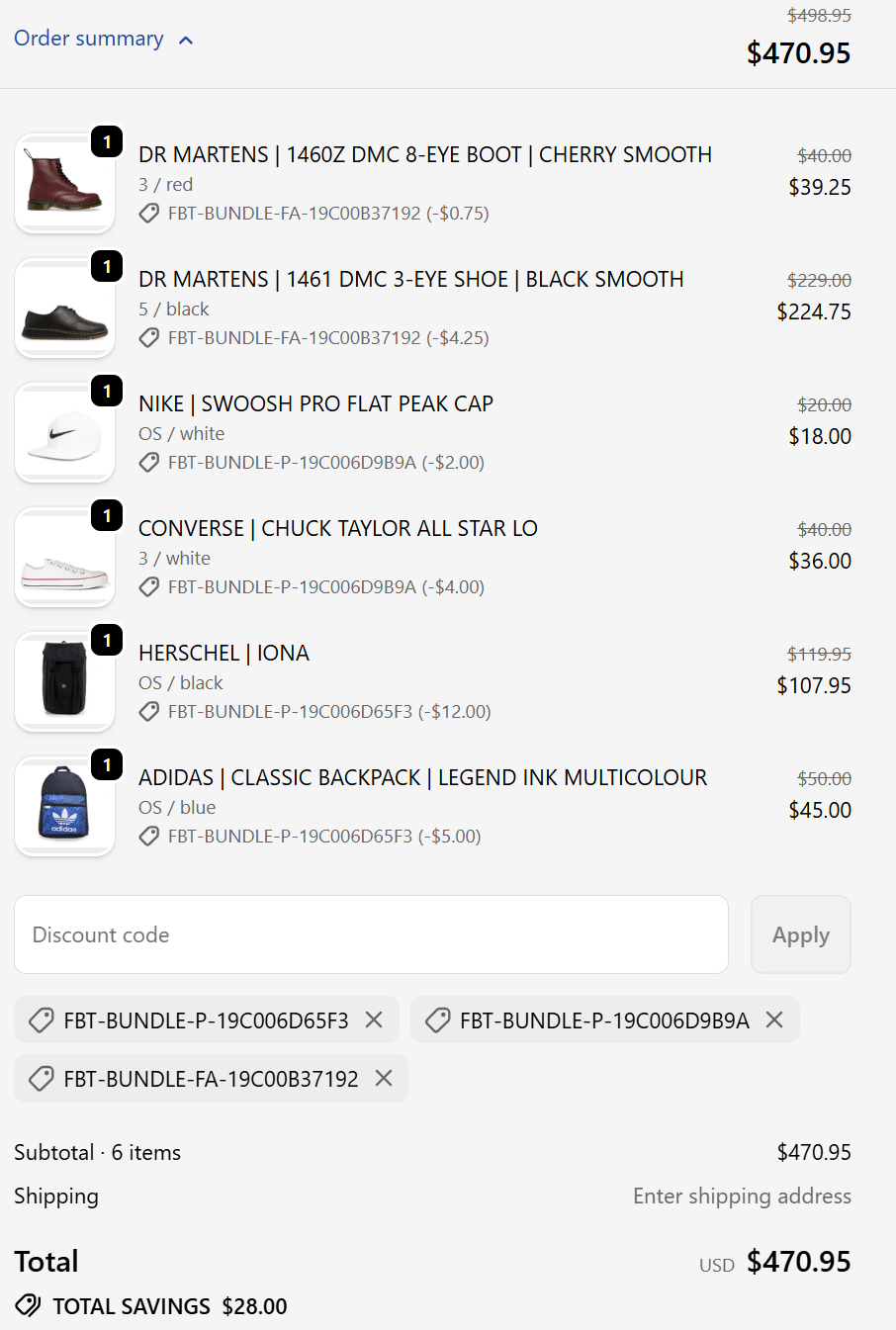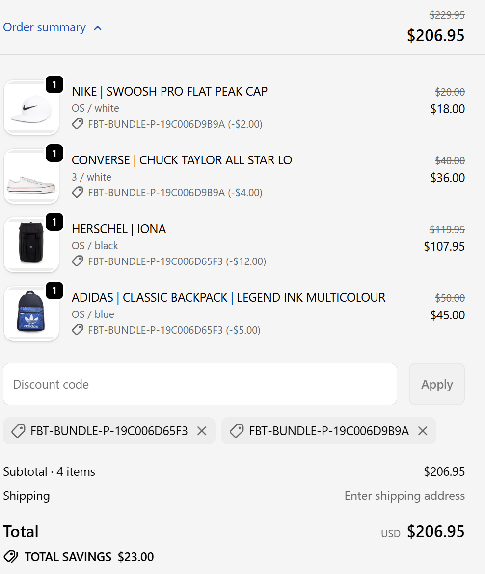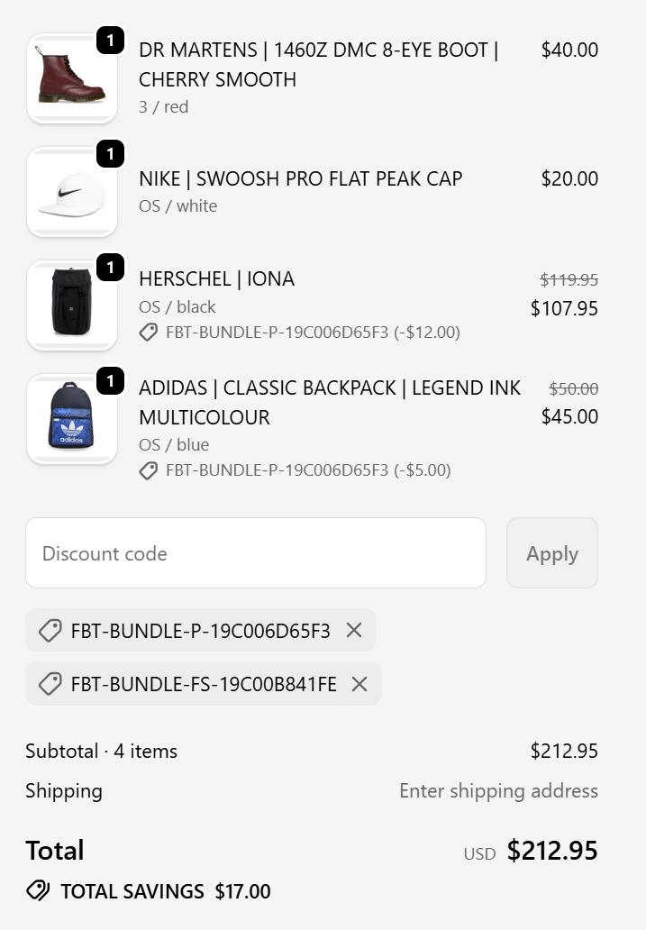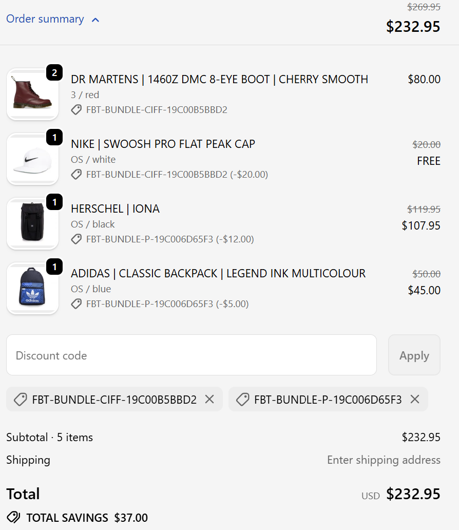 Let's see some checkout examples of Frequently Bought Together discounts supported combinations.