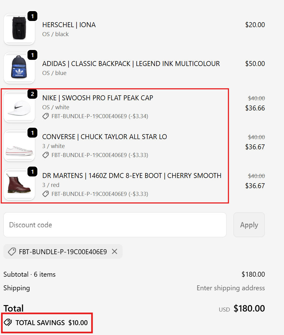 Since both bundles include the cap, Shopify will apply only the $10 USD discount (the best deal) after both are added to the cart: