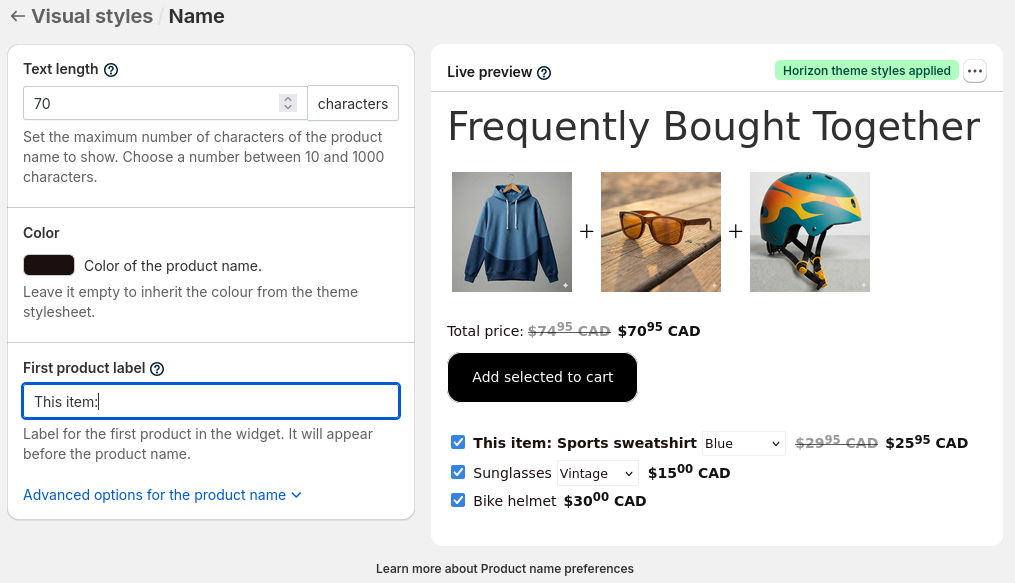 You will find that text in the app preferences page, in the Visual styles → Name section. There, you can translate the text for your primary store language.