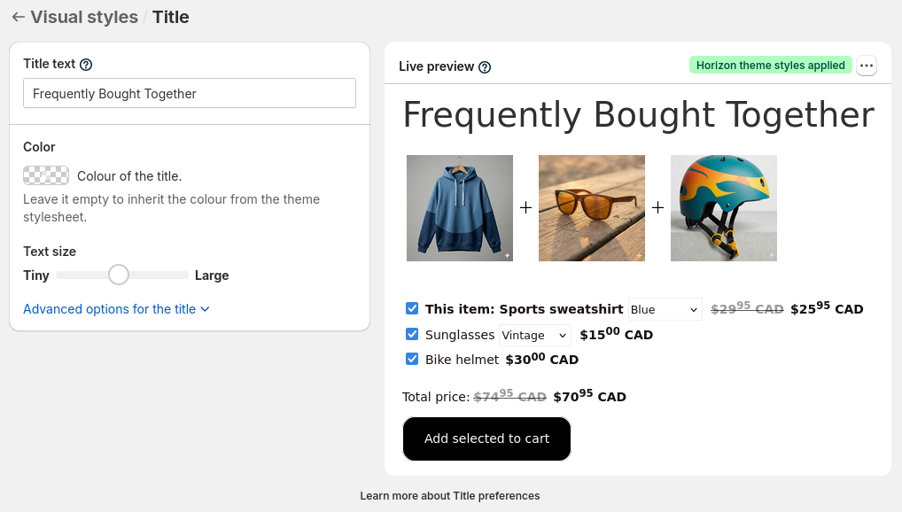 You can change the Frequently Bought Together title to meet your needs, as well as tune the styles to match your theme.