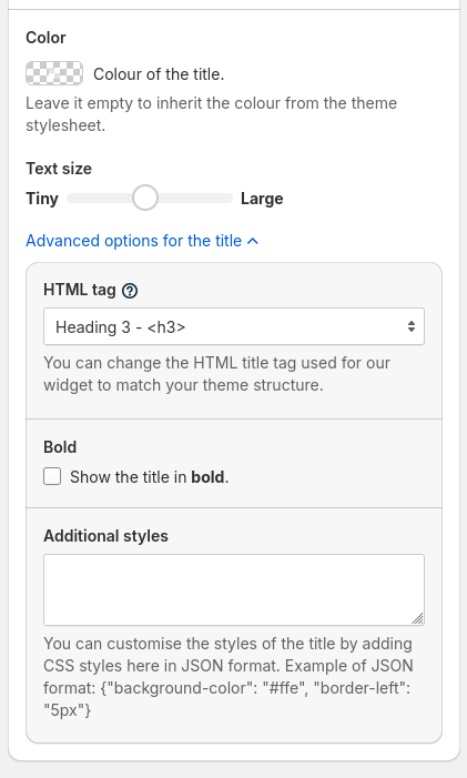 If you, for example, tick the show a bold text check box, resize the text a little and write this red color #EB4F47, the title will look like this:
