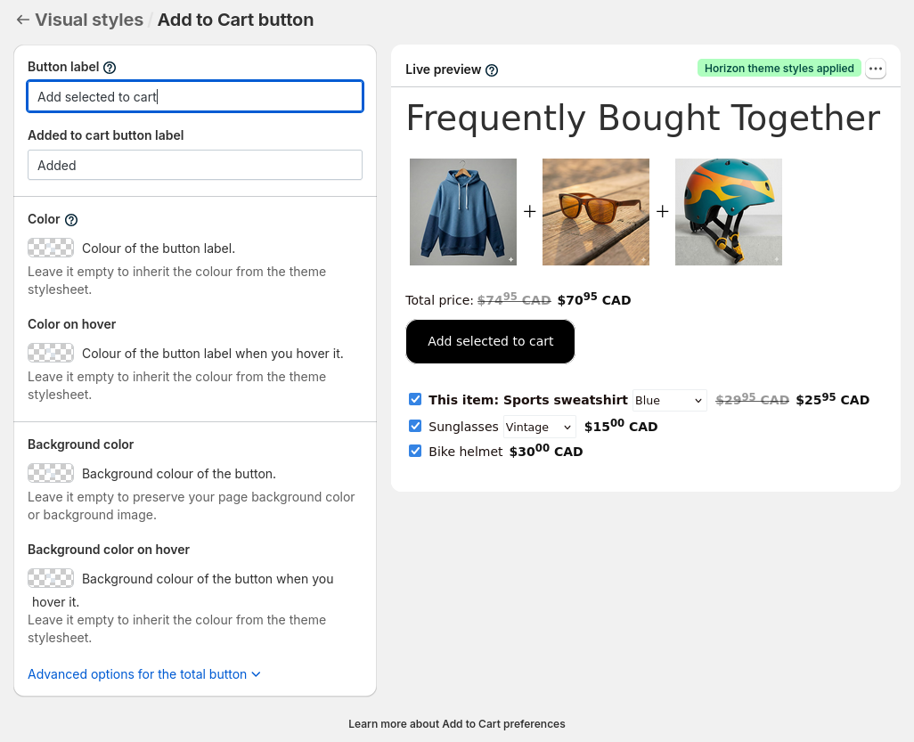 Just navigate to the Visual styles → Add to Cart button section to see its customization options.