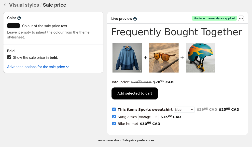 In the Visual styles section, navigate to any of the three different type of prices (Regular, Sale, Compare at), to display its style options: