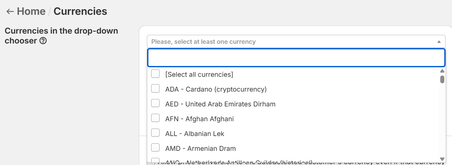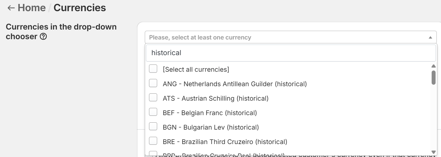 You can select the currencies you want to display in your store drop-down list easily on the Currencies section from the app preferences page: