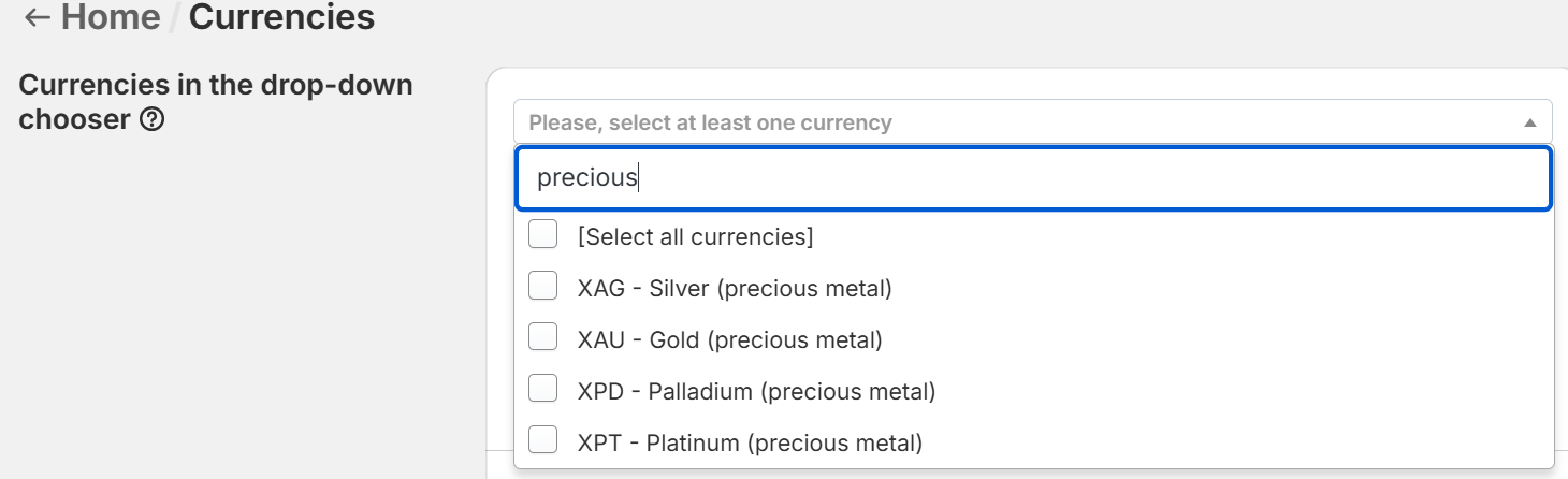 Historical currencies, cryptocurrencies and precious metals can be easily filtered by the search field, as in the following searches for historical: